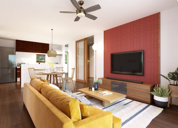 リビングを中心として部屋がつながるレイアウトで、自然なコミュニケーションを誘導。